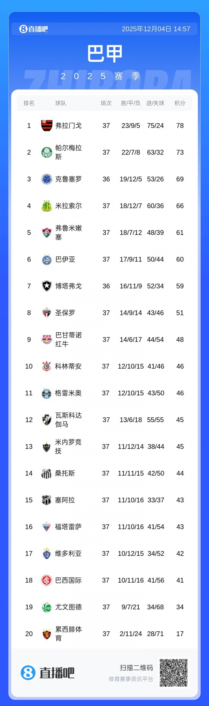 巴甲本轮除了克鲁塞罗vs博塔弗戈,其余比赛拆开,北京时辰12月8日凌晨3点10场收官战同开。桑托斯将迎战克鲁塞罗。