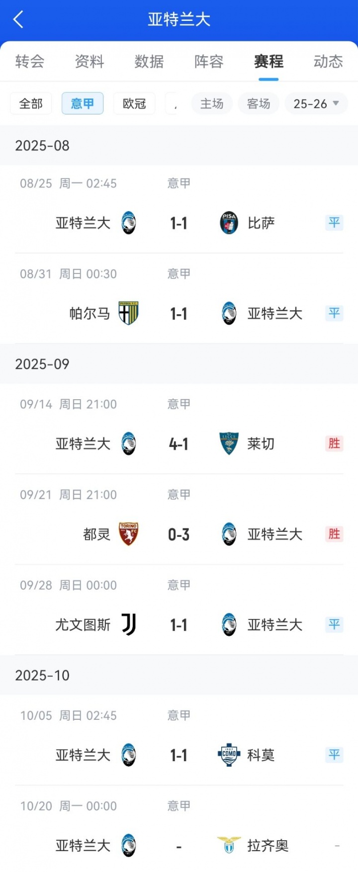 至此,意甲仅剩一支球队仍保捏不败:开赛以来2胜4平,积10分排行联赛第7的亚特兰大。本日凌晨0点,他们将镇守主场迎战拉都奥。