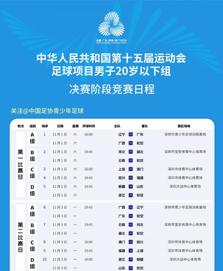 中华东说念主民共和国第十五届清爽会足球阵势男人20岁以下组决赛阶段竞赛日程