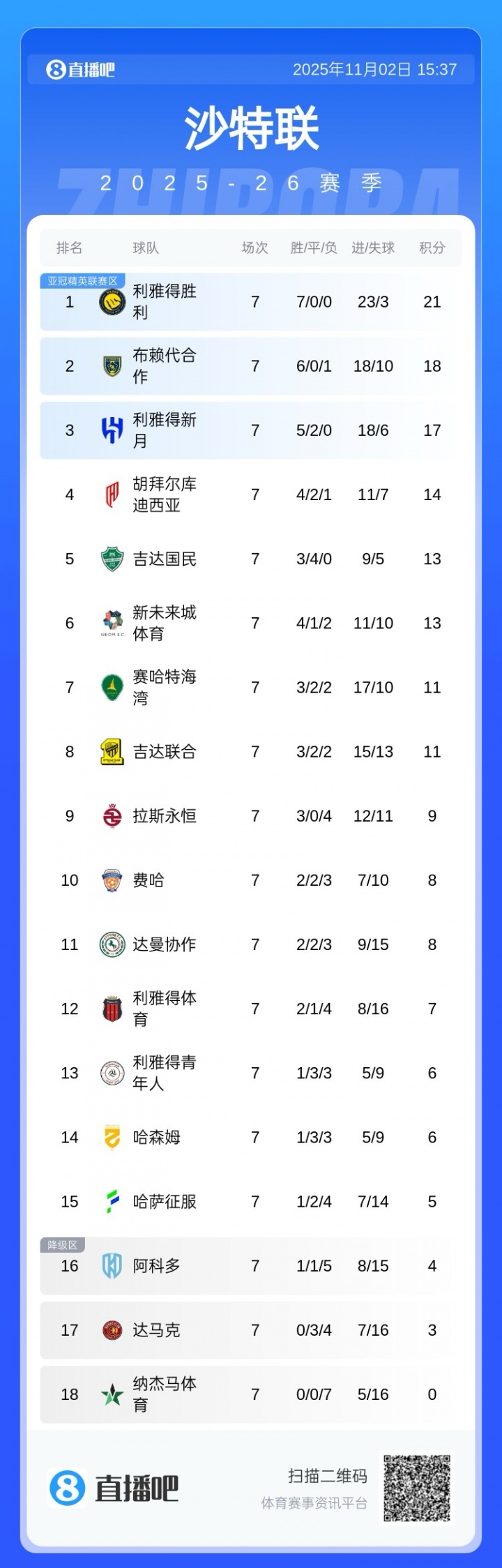 当今的沙特联积分榜