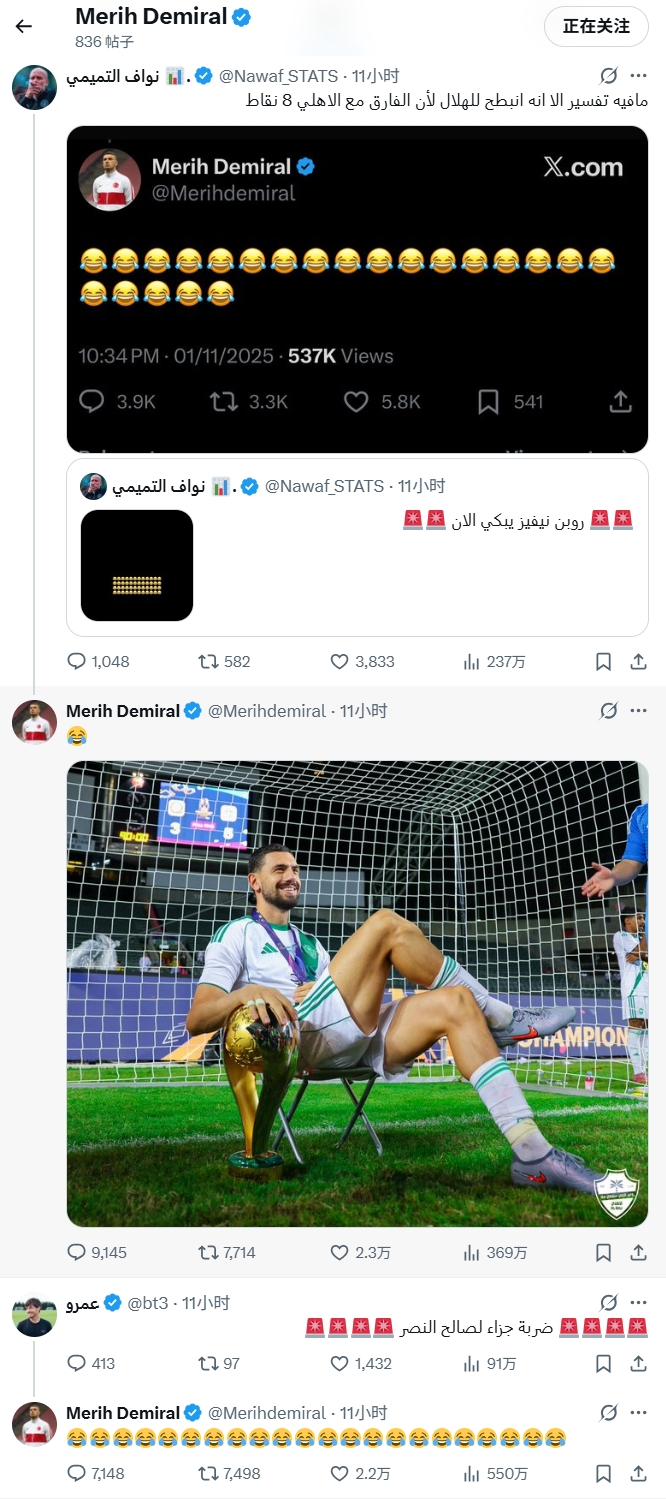 在目击VAR终末时分判给利雅得生效点球后,包括效劳于利雅得月牙的鲁本-内维斯、马尔科姆,以及效劳于吉达国民的马赫雷斯、德米拉尔均在外交媒体发出了一连串的笑哭神采。