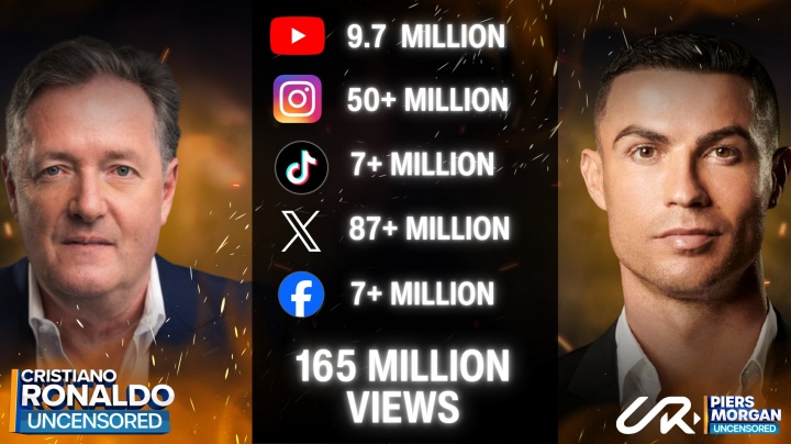 摩根与C罗的独家访谈于上周分两部分发布,分辩上线于多个酬酢媒体平台,其中油管平台浏览量就接近1000万,全平台总不雅看量达到1.65亿。