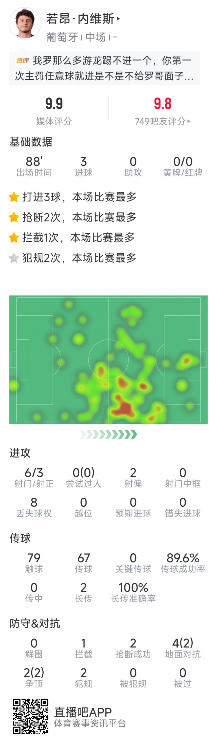 11月16日讯 在本轮世初赛,葡萄牙9-1打败亚好意思尼亚,内维斯演出帽子戏法,以下为他在本场数据: