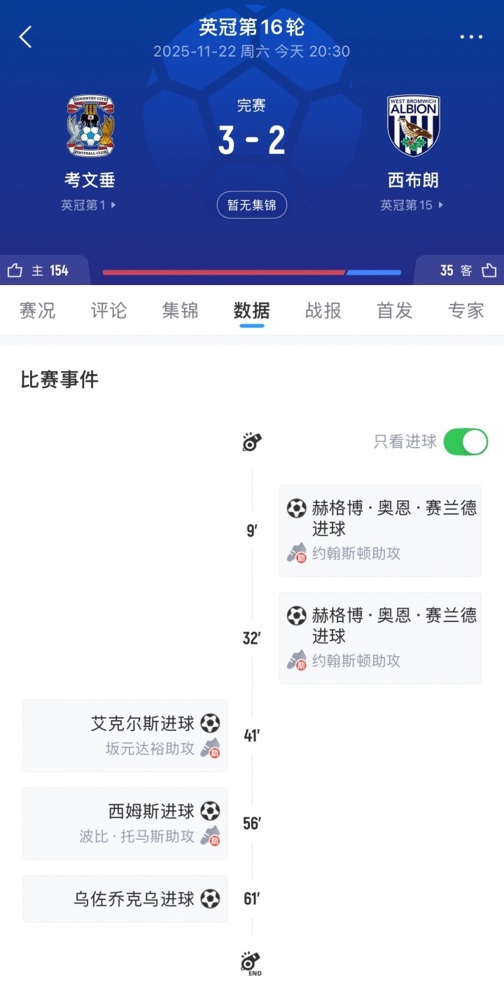 11月22日讯 当天英冠第16轮,考文垂在0-2逾期的情况下连入三球,最终3-2逆转十东说念主西布朗,第49分钟西布朗被罚下一东说念主成为比赛转动点。