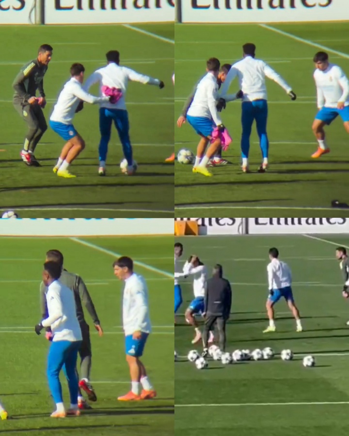 阿隆索饰演抢球者扮装时被维尼修斯穿裆,贡萨洛双手抱头难以置信。
