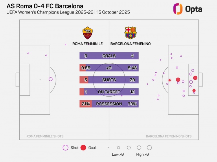 据Opta统计,巴萨女足本赛季开局各赛事9连胜,打进48球,仅丢2球,场均进球杰出5粒。