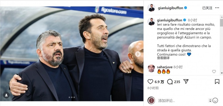 意大利国度队领队布冯社媒晒出与主帅加图索的合照,并写谈:“昨晚比赛的恶果相等进军,但更令我自傲的是蓝衣军团在赛场上展现的气魄和个性。”