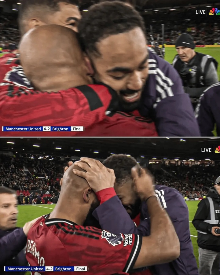 而终场哨声响起后,姆伯莫和库尼亚也振作地抱在沿途,牢牢相拥庆祝生效。