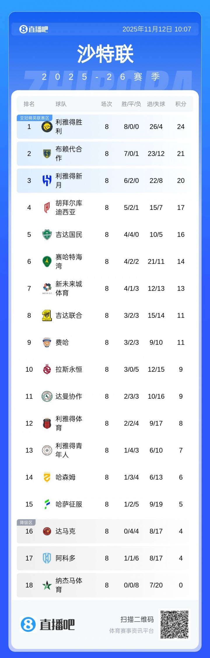 11月12日讯 沙特联第8轮,利雅得奏效3-1新昔日城体育。利雅得奏效8连胜积24分不竭领跑积分榜。