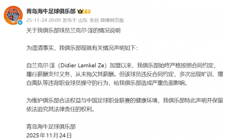11月24日讯 针对球员兰克尔·泽指控拖欠工资,以过火他一系列风云,青岛海牛发布了官方发挥。