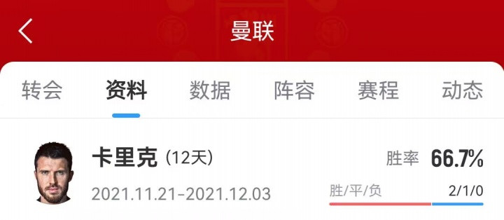 曼联2021年解老板帅索尔斯克亚后,卡里克曾片霎担任曼联的临时主帅。他带队的3场比赛保握不败,包括在欧冠中投降黄潜,以及联赛中投降阿森纳。