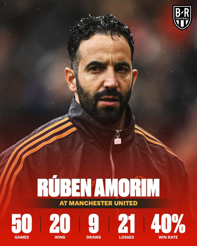 好意思媒B/R Football晒出海报,海报中摆列出阿莫林抓教曼联以来的战绩:50场比赛,20胜9平21负,胜率40%。