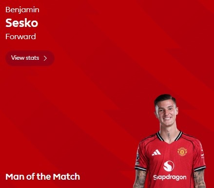 10月5日讯 2025-26赛季英超联赛第7轮,曼联2-0征服桑德兰。舍什科首发出战,赛后当选全场最好。