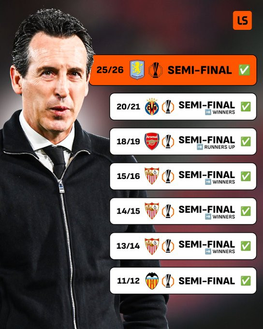 这是埃梅里第七次晋级下一轮 欧联准总决赛 :