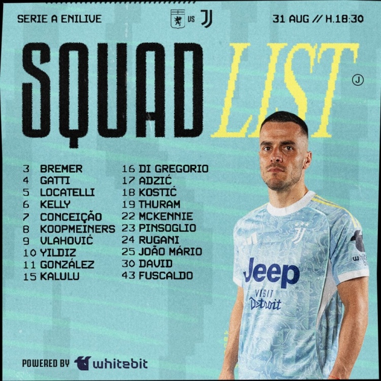8月30日讯 北京时辰9月1日凌晨1点,意甲第2轮,尤文将在客场对阵热那亚。比赛开动前,尤文臣方发布了球队大名单,布雷默镇守后防,伊尔迪兹领衔锋线,弗拉霍维奇入选。