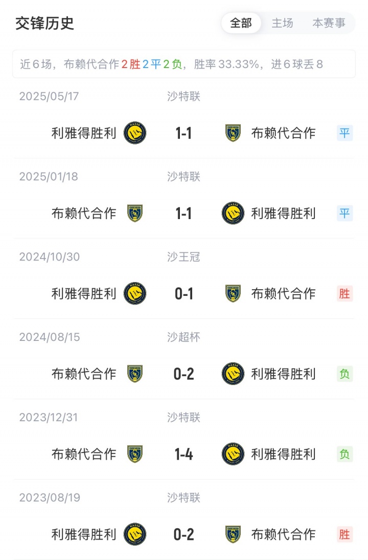 利雅取得手上赛季排行沙特联第三,布赖代配合排行第八,近三场平直对接到手2平1负。