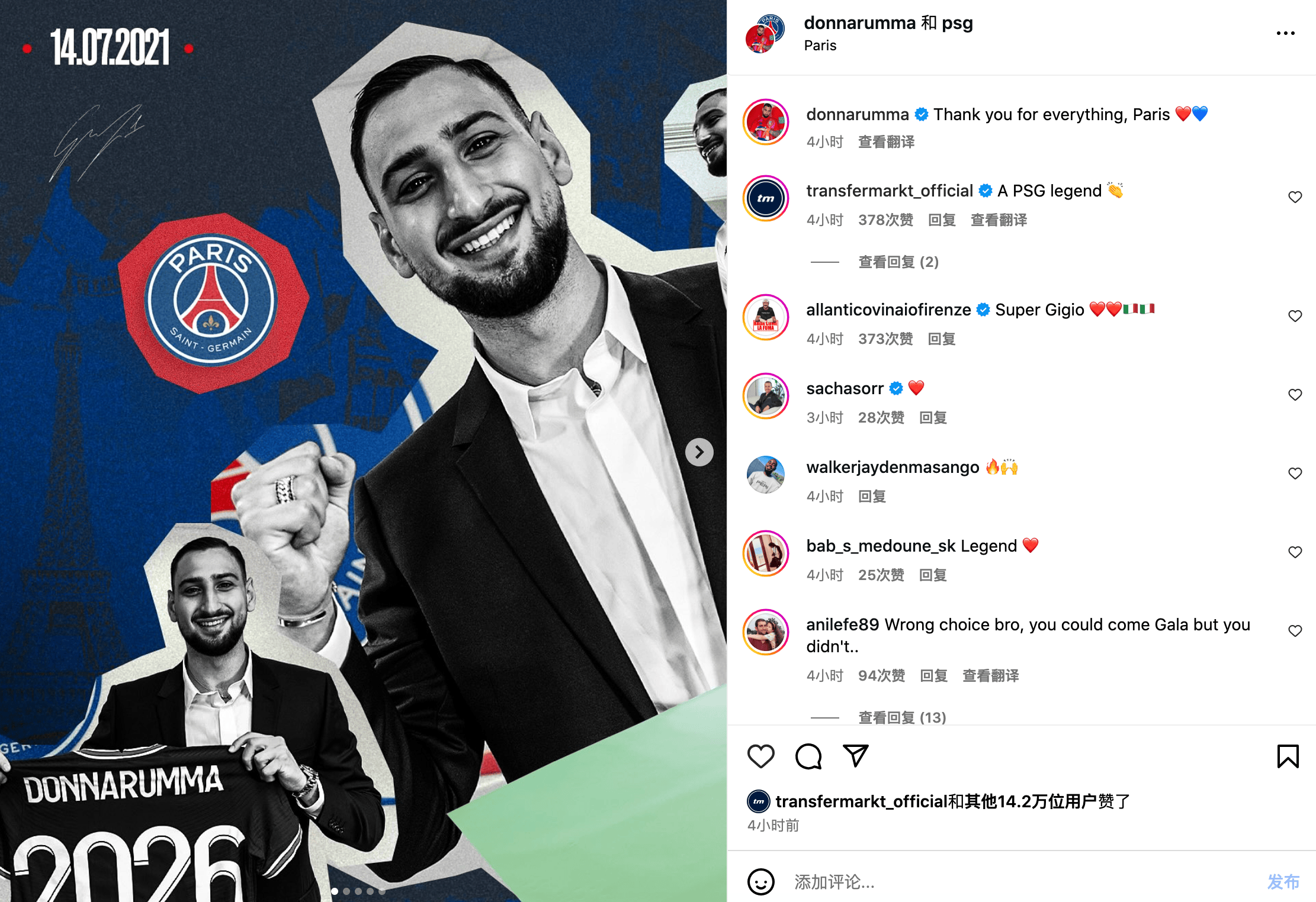 虎扑09月03日讯意大利门将多纳鲁马崇拜转会至曼城。他在酬酢媒体上上前东家巴黎圣日耳曼告别。