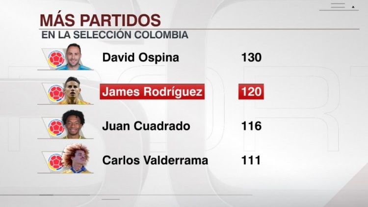 据ESPN统计,此役是J罗为哥伦比亚国度队出战的第120场比赛,队史出场次数仅少于奥斯皮纳。