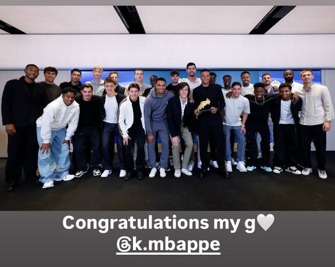 贝林厄姆也通过社媒晒出了皇马全队同手捏金靴奖杯姆巴佩的合影,并配文:“祝愿我的昆玉@姆巴佩”。