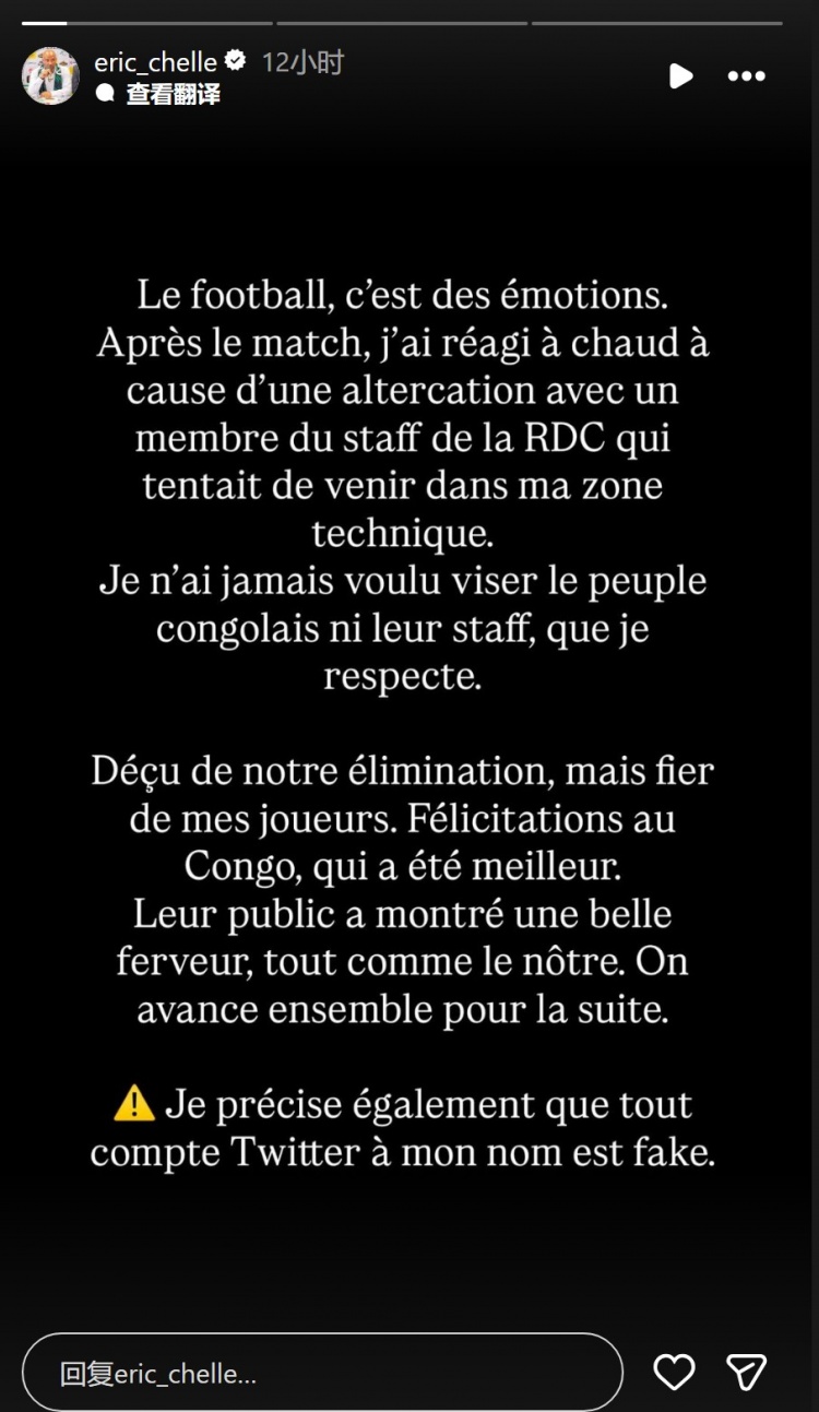 固然球队出局令我感到失望,但我为我的球员们感到孤高。道贺民主刚果,他们暴露更好。他们的球迷展现了极大的温和,咱们的球迷也相似。让咱们沿路上前看,理睬昔日。
