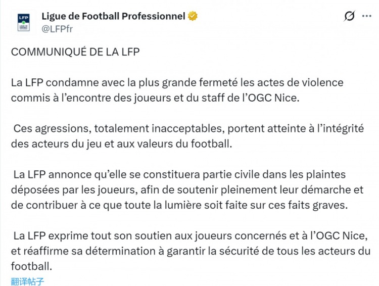 法国干事足球定约向关连球员和尼斯足球俱乐部抒发全力维持,并重申其保险足球界扫数东谈主员安全的决心。